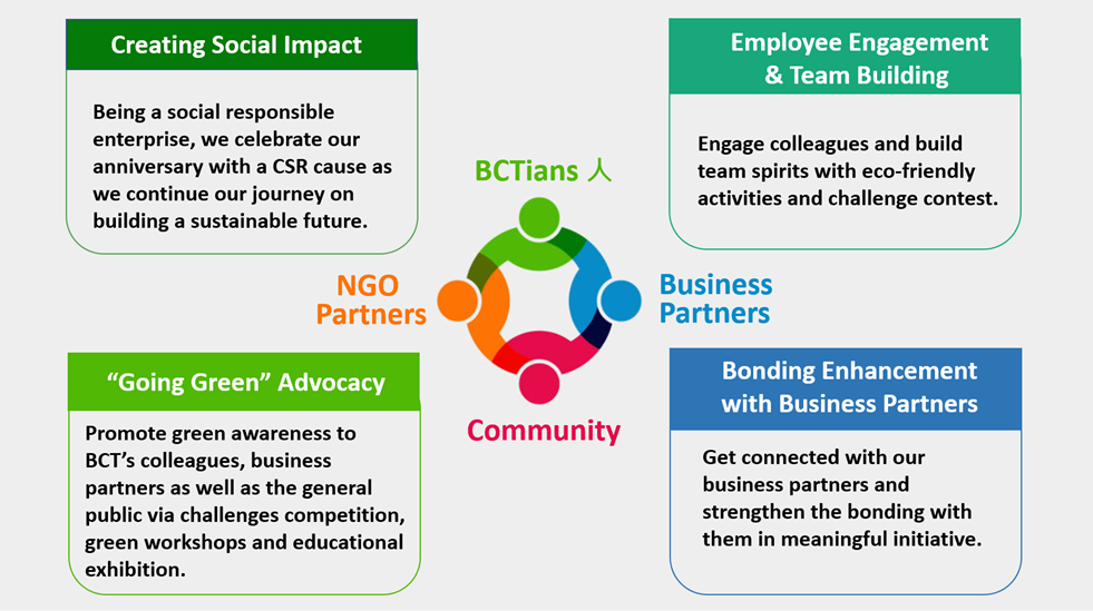 Since 2014, BCT has been recognized in World Green Organisation's ("WGO") "Green Office Awards Labelling Scheme" and "Sustainable Business Award” for our efforts made in environmental protection, workplace quality, green operations practices and community involvement.