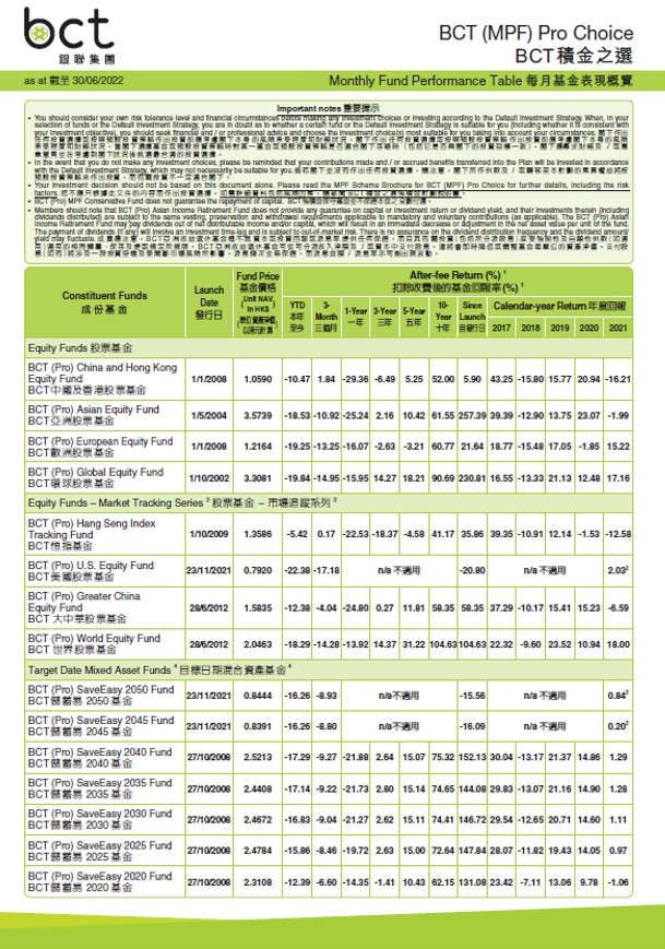 We offer two different MPF schemes: BCT (MPF) Pro Choice, a master trust scheme and BCT (MPF) Industry Choice, an industry scheme to cater to different employees in Hong Kong.